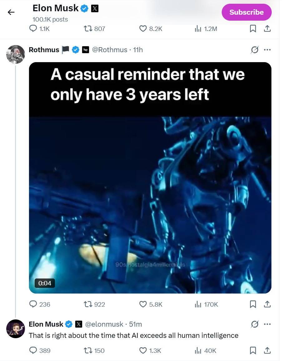 凤凰网科技讯 3月27日,埃隆·马斯克在社交平台X上回复网友发布的视频时表示,人工智能将在3年后超过所有人类智能。