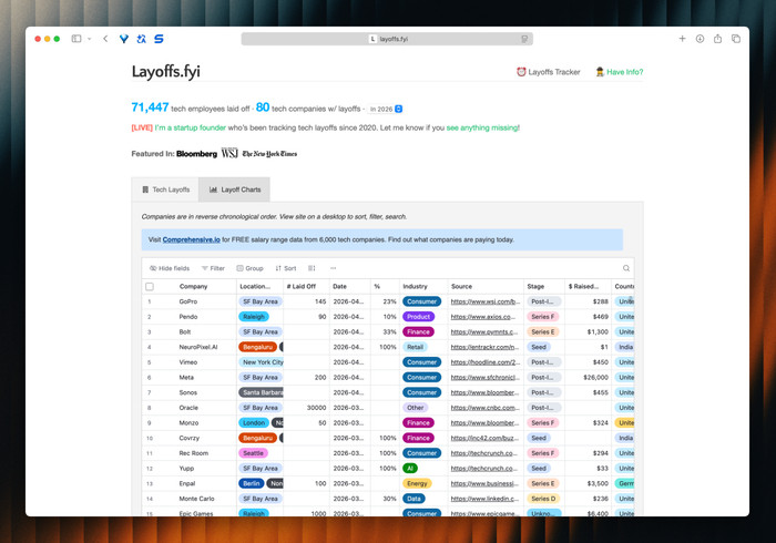 商业数据平台RationalFX统计称,今年第一季度全球科技行业裁员近8万人,约四分之三都发生在美国,近一半裁员都归因于人工智能及工作自动化影响。追踪科技裁员规模的数据库Layoffs.fyi统计称,2026年已有超7万名科技从业者被裁员,涉及80家公司。