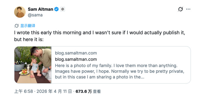 首次袭击发生后,萨姆·奥尔特曼对外发布博客长文呼吁人们保持冷静。他罕见地分享了一张家人照片,他的伴侣和他的孩子,“Hereisaphotoofmyfamily,Ilovethemmorethananything.”他说,他相信照片是有力量的,希望它能阻止下一个朝他家里扔燃烧瓶的人。